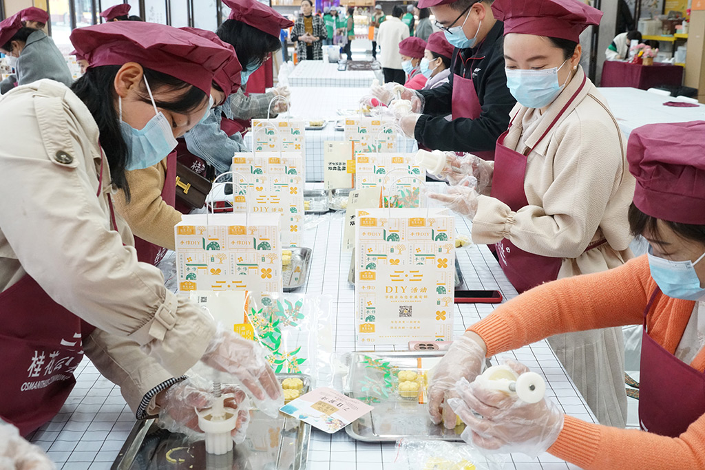 第一項(xiàng)活動(dòng)是動(dòng)手制作桂花糕。桂花糕在桂林已經(jīng)有近百年的歷史,因桂花得名,體現(xiàn)桂林歷史和傳統(tǒng)文化印記。大家手拿模具,在老師的指導(dǎo)下,有模有樣地動(dòng)手制作桂花糕,制作過(guò)程中時(shí)而向身邊人討教制作技巧,時(shí)而交換模具制作出不同的樣式,歡聲笑語(yǔ)中一個(gè)個(gè)芳香四溢的桂花糕躍然眼前,女職工們體驗(yàn)到了勞動(dòng)帶來(lái)的快樂(lè)愉悅。